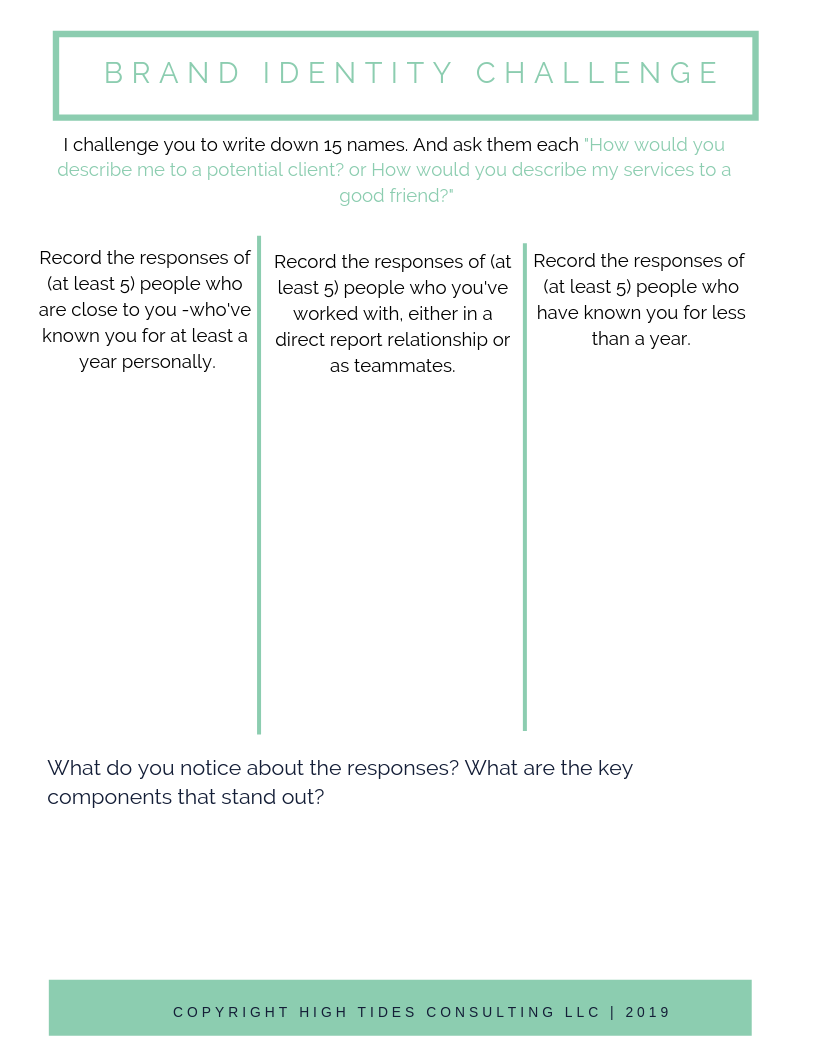 So, I wanted to pose a branding challenge, and this is a great exercise whether you’re trying to get yourself together on your LinkedIn profile, or you’re a branding business owner and trying to figure out how to position yourself and your voice on your website. No matter where you are on the spectrum, in terms of thinking about identity and branding, this is a really fun challenge that I encourage you to take on. The challenge is this: distill your brand using only friends and family members’ perception of you.